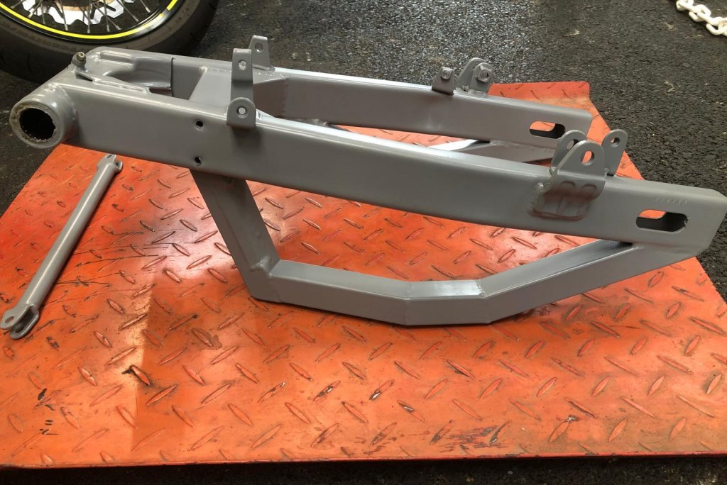 La SRX-GEP est doté d’un faux-cadre très bien dimensionné. Ce qui limite beaucoup la torsion du châssis. Très vite, la fourche à balancier a été installée pour améliorer le guidage de Pénélope en apportant rigidité, précision et anti-plongée. La dernière zone susceptible de se tortiller côté moto, c’est la roue arrière. Mais pour un usage familial, ça restait suffisamment rigide.